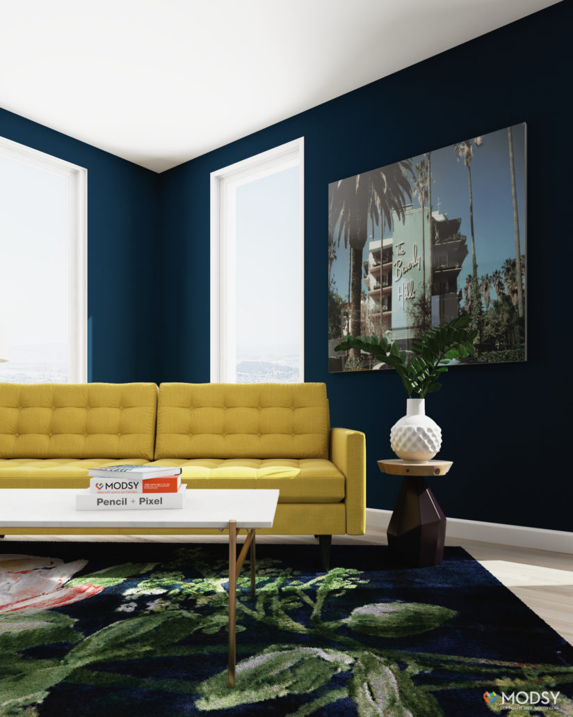 Plopped inside this sweet little living space is the final iteration of our Petrie sofa. A golden yellow hue reminiscent of bold Mid-Century interiors, this version of the Petrie is “seated” inside an eclectic living room. This space is comprised of a mix of materials, colors, and styles, which mesh together and create a playful and invigorated living room. The consistent color palette of yellows and blues here keeps the space feeling cohesive, while the intentional combination of Mid-Century forms – such as the Petrie sofa, the tripod lamp, or the Beverly Hills Hotel artwork (to name a few) – give our living room an air of design sophistication.