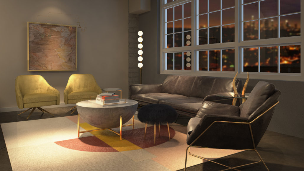 - The Darbuka Brass Coffee Table (CB2) perfectly combines an organic stone surface with a modern gold base. Add a touch of luxury with the sumptuous green velvet Roar + Rabbit Swivel Chair (West Elm).